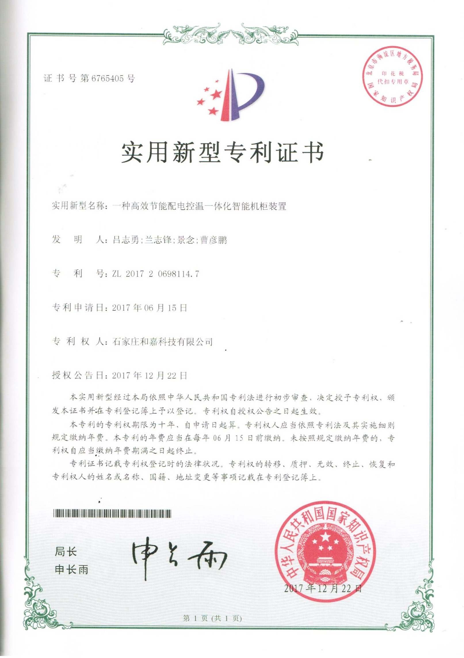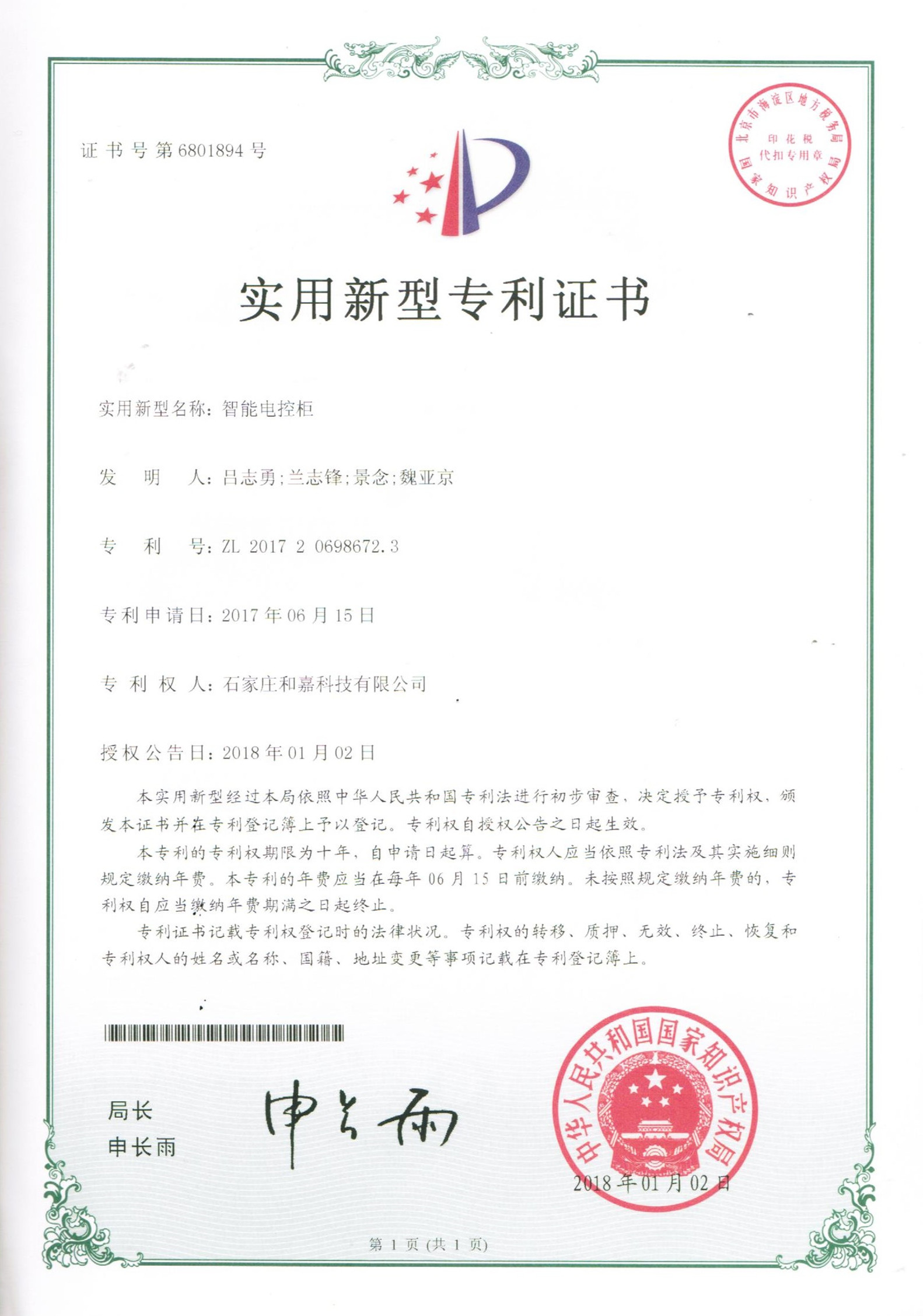 實(shí)用新型專利證書-智能電控柜