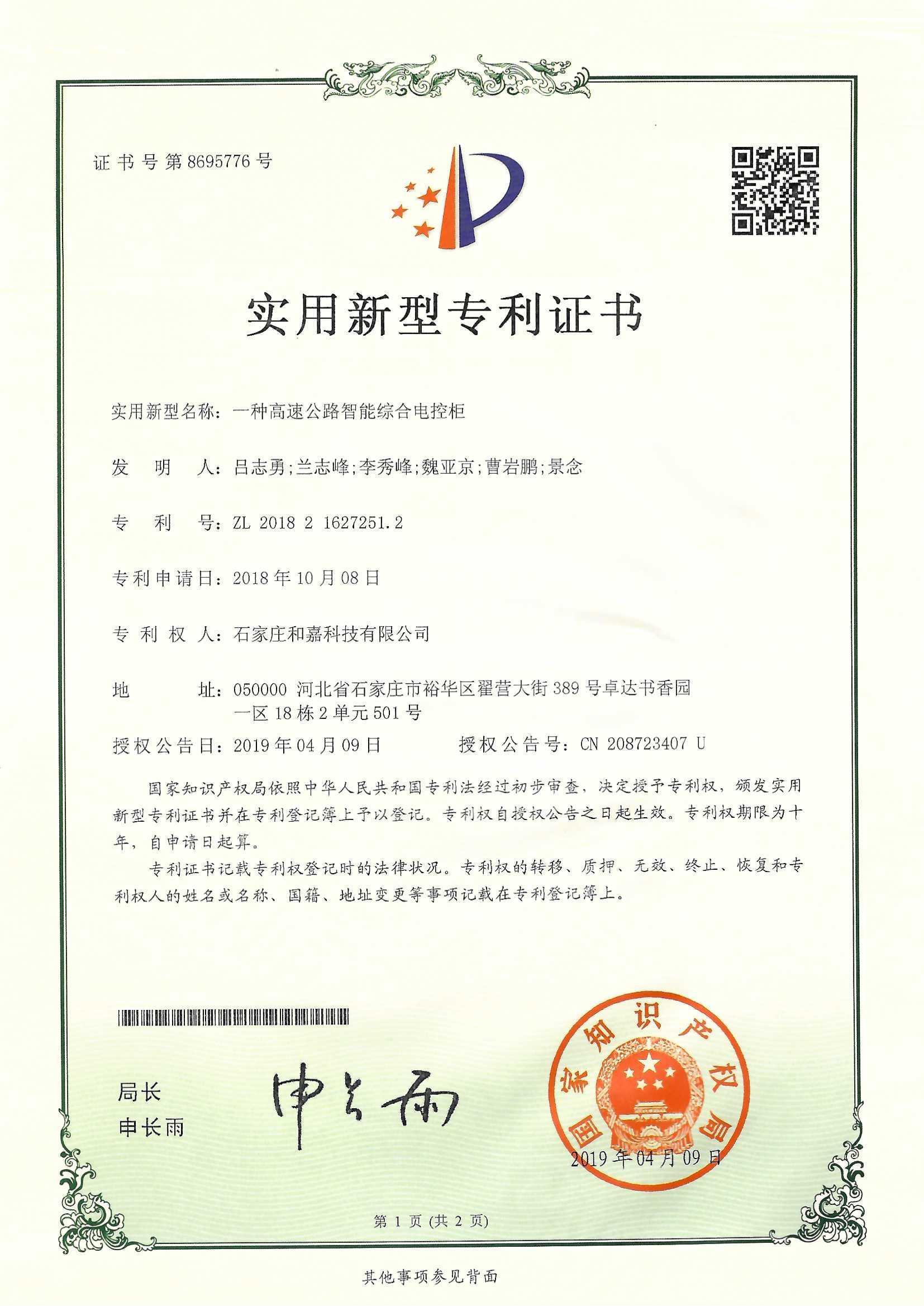 實(shí)用新型專利證書—一種高速公路智能綜合電控柜