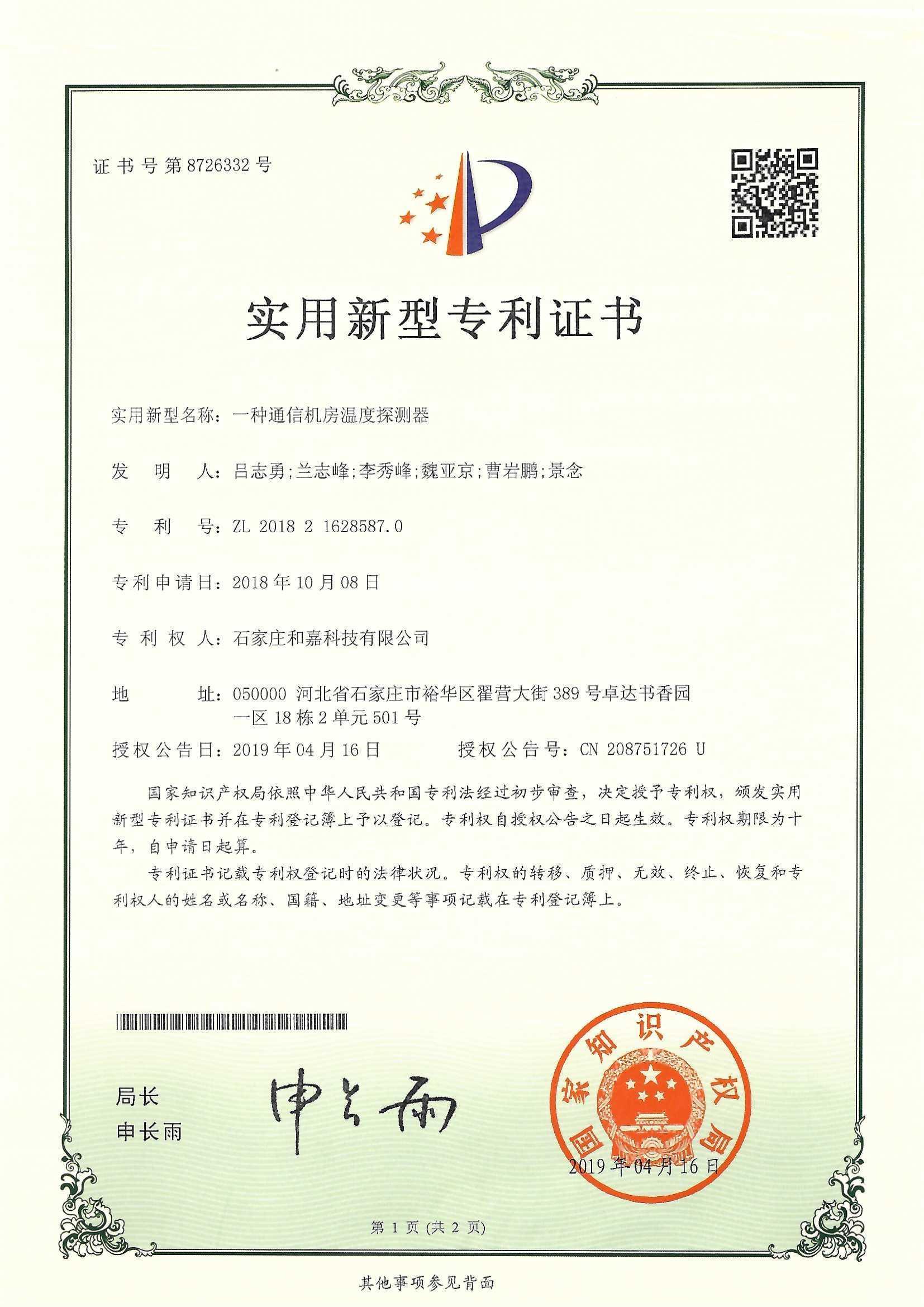 實(shí)用新型專利證書-一種通信機(jī)房溫度探測(cè)器