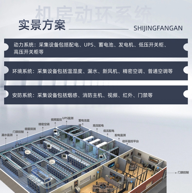 機房動環監測系統,全稱為機房動力環境監測系統,主要負責對機房內的動力設備、環境參數以及安防狀況進行實時監測與管理。動力設備涵蓋了 UPS(不間斷電源)、配電柜、發電機等,它們為機房提供持續穩定的電力供應。環境參數包括溫濕度、漏水、煙霧等,這些因素對機房設備的正常運行至關重要。安防狀況則涉及門禁系統、視頻監控等,保障機房的物理安全。