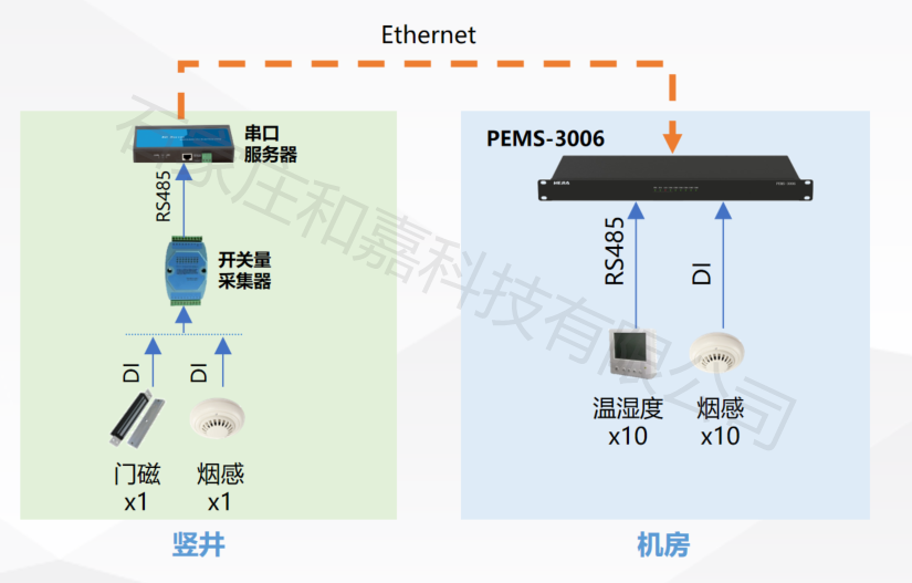核心設(shè)備:機房端:部署一臺嵌入式監(jiān)控主機,作為數(shù)據(jù)處理中樞。豎井端:開關(guān)量采集器(如MD82):將門磁、煙感等8路開關(guān)信號轉(zhuǎn)為1路RS485。串口服務(wù)器(如SS60-2):將RS485信號轉(zhuǎn)換為以太網(wǎng),通過局域網(wǎng)傳輸。