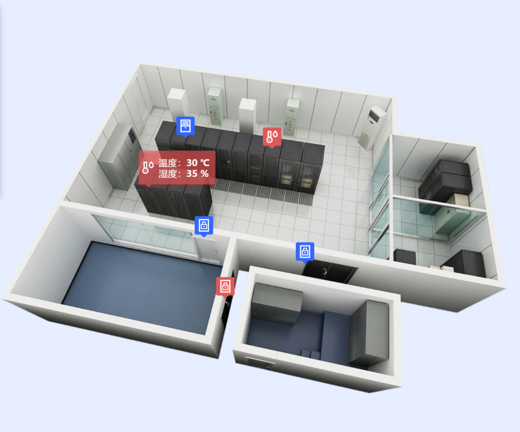 場景圖:管理人員選中機房后,可采用和實景圖一致的方式展示該機房設備當前情況。