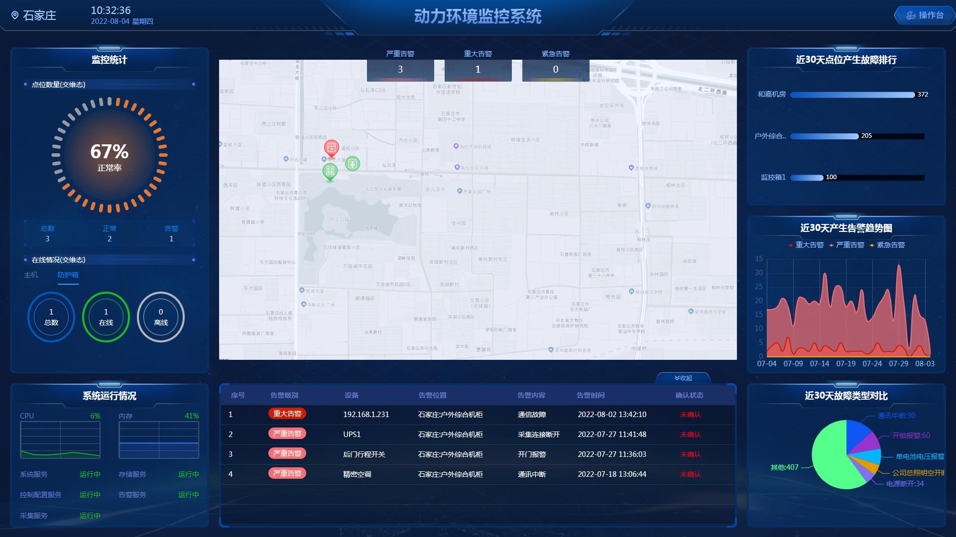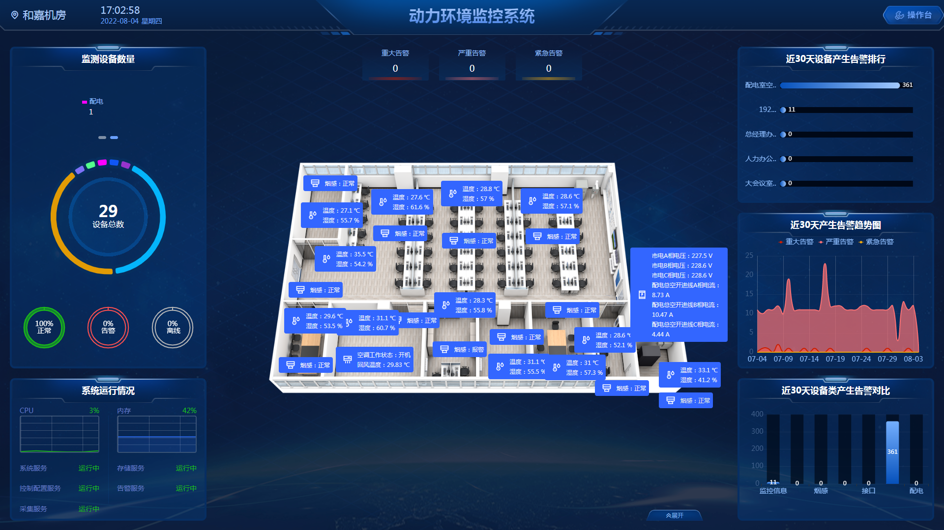 多機房系統(tǒng)平臺首頁地圖多個機房總覽,支持圖片格式和GIS矢量地圖格式,實現(xiàn)多機房經(jīng)緯度定位,3D電子地圖呈現(xiàn)機房的布局全景,動態(tài)展現(xiàn)機房運行狀態(tài)。在權(quán)限管理上,支持根據(jù)運維人員負責(zé)的區(qū)域分配對應(yīng)的權(quán)限及設(shè)備,運維更精準(zhǔn)。