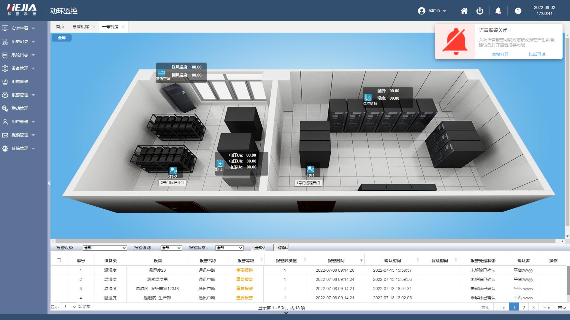 在動環(huán)監(jiān)控功能平臺上,管理員可以根據(jù)實際需要,定制監(jiān)控對象和參數(shù)。3D界面實時展示環(huán)境、動力、安防系統(tǒng)狀態(tài),可查詢歷史數(shù)據(jù)記錄,告警信息推送,隨時隨地運維。