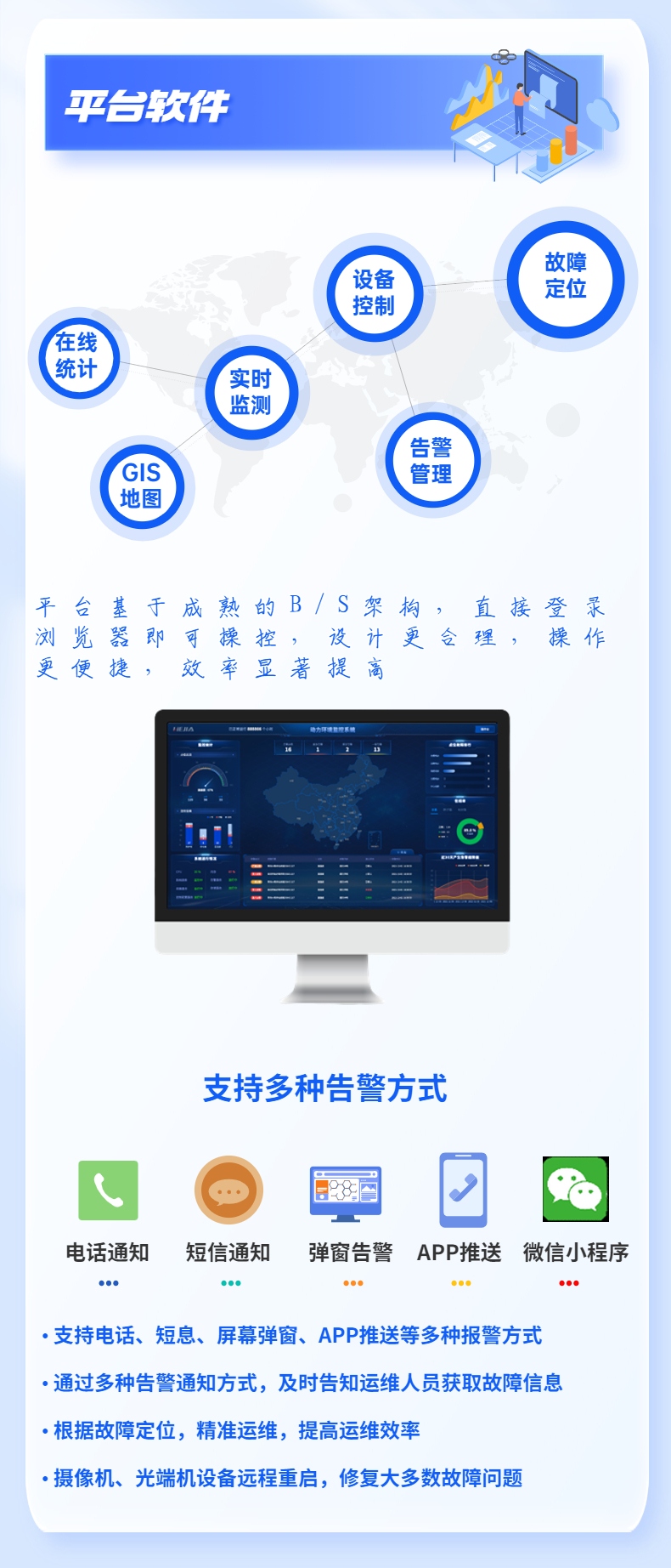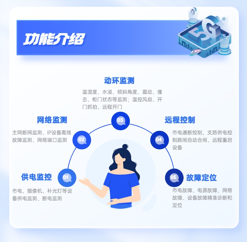 智能監控箱可以對防雷、電源、箱門開啟、溫度和濕度進行精準故障定位,自動監測故障原因,自動修復故障,節省運行維護時間和人力。