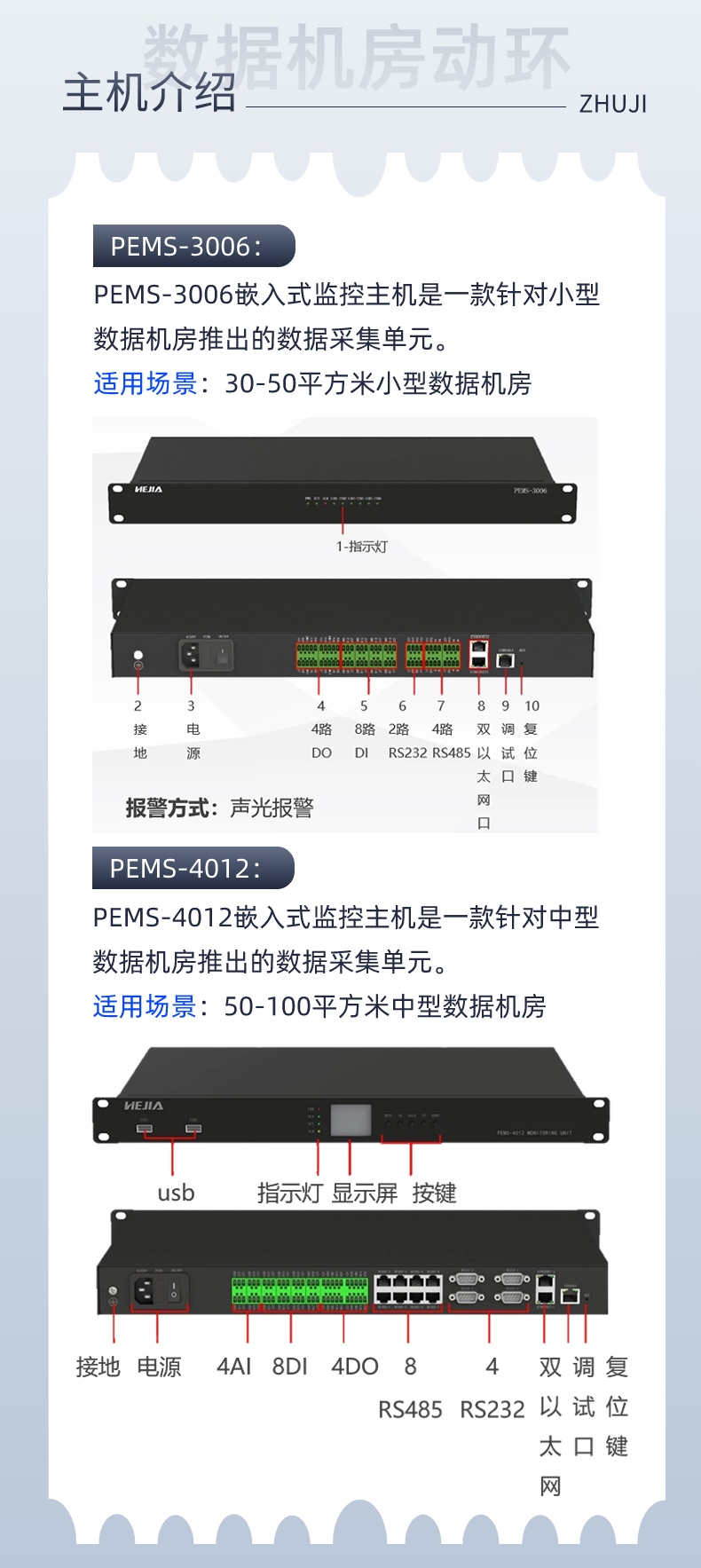 1、適用于30-50平方米小型數據機房,可選擇PEMS-3006嵌入式監控主機是一款針對小型數據機房推出的數據采集單元。