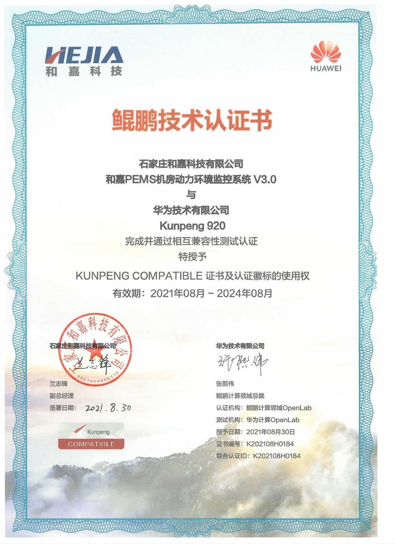 PEMS機房動力環境監控系統 V3.0與與華為的鯤鵬處理器進行測試,操作系統可適配Kylin V10和Linux V7.6,并獲得相應的認證證書。