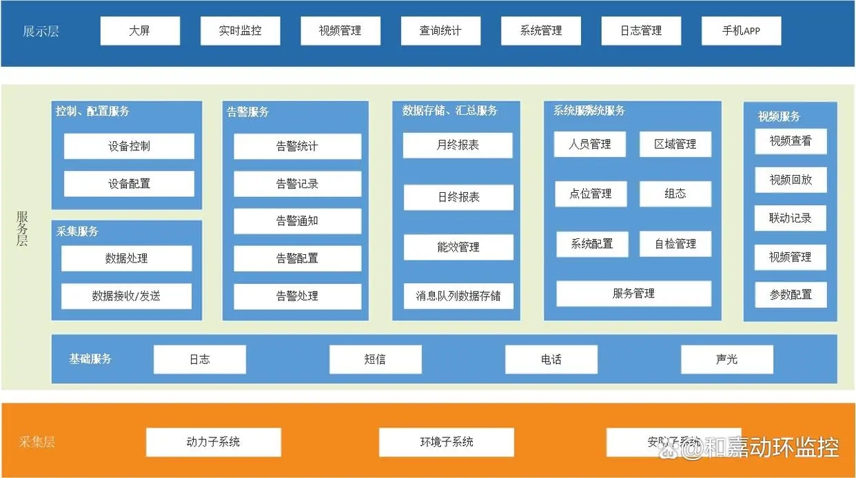 聯(lián)網(wǎng)機房動環(huán)監(jiān)控解決方案的總體架構(gòu)包括數(shù)據(jù)采集層、數(shù)據(jù)傳輸層、數(shù)據(jù)處理層和數(shù)據(jù)展現(xiàn)層四個部分。