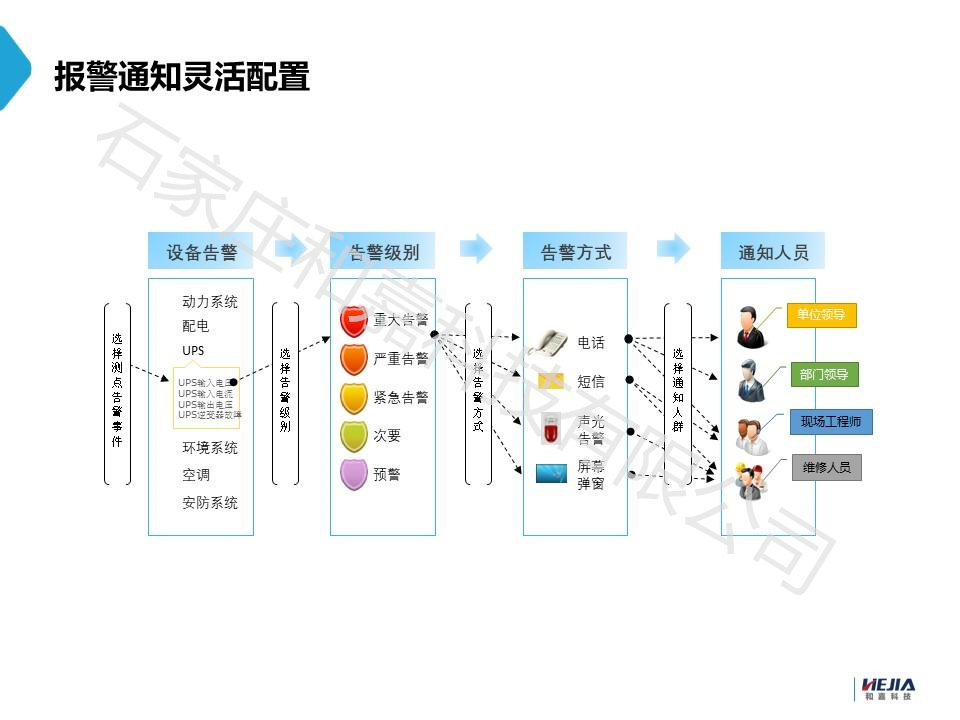 2、智能告警與通知:當系統檢測到任何異常參數或設備故障時,會立即觸發告警機制。告警通知可以通過多種方式發送給相關人員,如短信、郵件、電話、手機APP推送等,確保管理人員能夠迅速得知并處理。