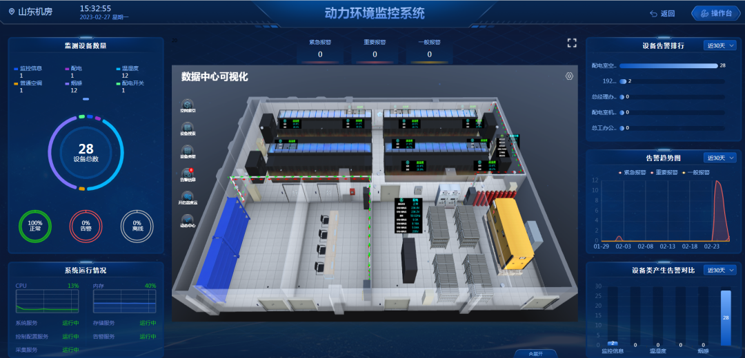 動環系統是將單個或多個機房內的基礎設施進行全面的監控與管理,對各類機房的動力設備、環境設備、安防設備以3D可視化展現形式,在界面上直觀展示,操作簡單,實現機房內的7*24小時無人監控管理,預見或及時感知故障,通過多種報警方式提前決策迅速排障,以保障設備安全、穩定運行。