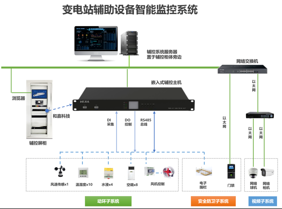 變電站智能輔控屏柜集成了對變電站內門禁、視頻監控、溫濕度監測、漏水監測、風速監測、風機控制、電子圍欄監測等信號的實時集中監控及遠程智能管理,助力變電站實現向“無人值班、少人值守”的新模式轉型。