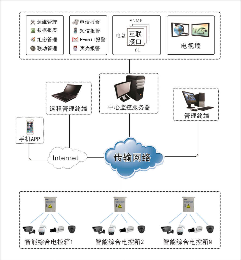 室外綜合電控柜運(yùn)維管理系統(tǒng)是專為滿足高速公路全程監(jiān)控要求,自主研發(fā)的一款集遠(yuǎn)程監(jiān)測(cè)、智能集中供電、防雷、動(dòng)環(huán)監(jiān)控、遠(yuǎn)程復(fù)位、報(bào)警處理等功能為一體的室外綜合電控柜運(yùn)維管理系統(tǒng)。可以實(shí)現(xiàn)對(duì)外場(chǎng)監(jiān)控?cái)z像機(jī)、情報(bào)板和氣象站等設(shè)備運(yùn)行狀態(tài)的監(jiān)測(cè),及對(duì)設(shè)備柜內(nèi)的供電系統(tǒng)、工業(yè)以太網(wǎng)交換機(jī)、防雷器和柜內(nèi)溫濕度等設(shè)備運(yùn)行狀態(tài)的監(jiān)測(cè),當(dāng)監(jiān)測(cè)到全程監(jiān)控系統(tǒng)中任何一個(gè)設(shè)備發(fā)生故障時(shí),柜內(nèi)嵌入式監(jiān)控主機(jī)通過以太網(wǎng)、2G/3G/4G、NB-IOT等多種網(wǎng)絡(luò)將采集的設(shè)備運(yùn)行信息和報(bào)警信息上傳到監(jiān)控中心或云運(yùn)維平臺(tái),實(shí)現(xiàn)集中監(jiān)控,集中報(bào)警,并告知管理員;當(dāng)監(jiān)測(cè)到攝像機(jī)出現(xiàn)死機(jī)、丟失圖像等故障時(shí)可以通過遠(yuǎn)程控制進(jìn)行復(fù)位排除故障;并在監(jiān)控的同時(shí)實(shí)時(shí)記錄和處理各種設(shè)備運(yùn)行及報(bào)警數(shù)據(jù),對(duì)設(shè)備的供電系統(tǒng)、網(wǎng)絡(luò)系統(tǒng)進(jìn)行綜合管理,以保障設(shè)備穩(wěn)定運(yùn)行、提高管理人員工作效率,實(shí)現(xiàn)機(jī)電設(shè)備的少人或無(wú)人值守。同時(shí),室外綜合電控柜還提供了豐富的接口資源,如開關(guān)量輸入接口、繼電器輸出接口、RS232、RS485接口、以太網(wǎng)接口、電源輸出接口,方便其它設(shè)備的接入與供電。其系統(tǒng)設(shè)計(jì)運(yùn)行穩(wěn)定、操作方便獲得用戶一致好評(píng)。