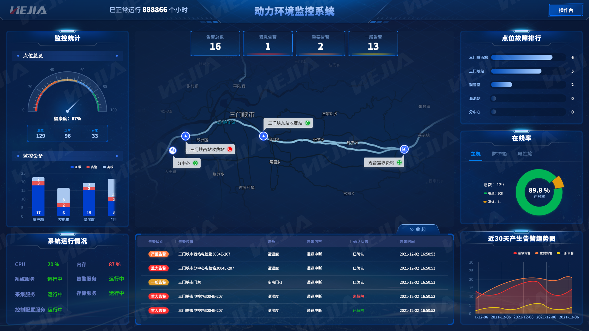 智能運維管理平臺是專為智慧城市、智慧交通的外場設備運維管理設計開發,對前端設備的運行情況、供電情況、網絡傳輸、防雷保障等幾個方面進行精準、全面地實時監控,準確定位故障,實現對設備的精細化運維保障。系統采用B/S架構,分布式設計,支持手機APP,支持通過以太網、GPRS/4G等多種網絡連接。平臺由監控中心平臺軟件、傳輸網絡、智能通信防護箱三部分組成,是一個集采集、診斷、定位、控制、管理、分析、報警等功能于一體的智能運維管理平臺。