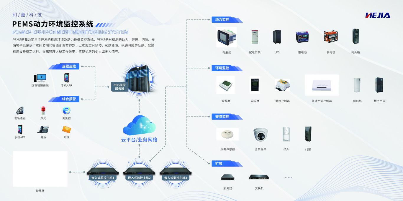 PEMS動力環境監控系統是對機房的動力、環境、消防、安防等子系統進行實時監測和智能化調節控制,以實現實時監控、預防故障、迅速排障等功能,保障機房設備穩定運行、提高管理人員工作效率,實現機房的少人或無人值守。
