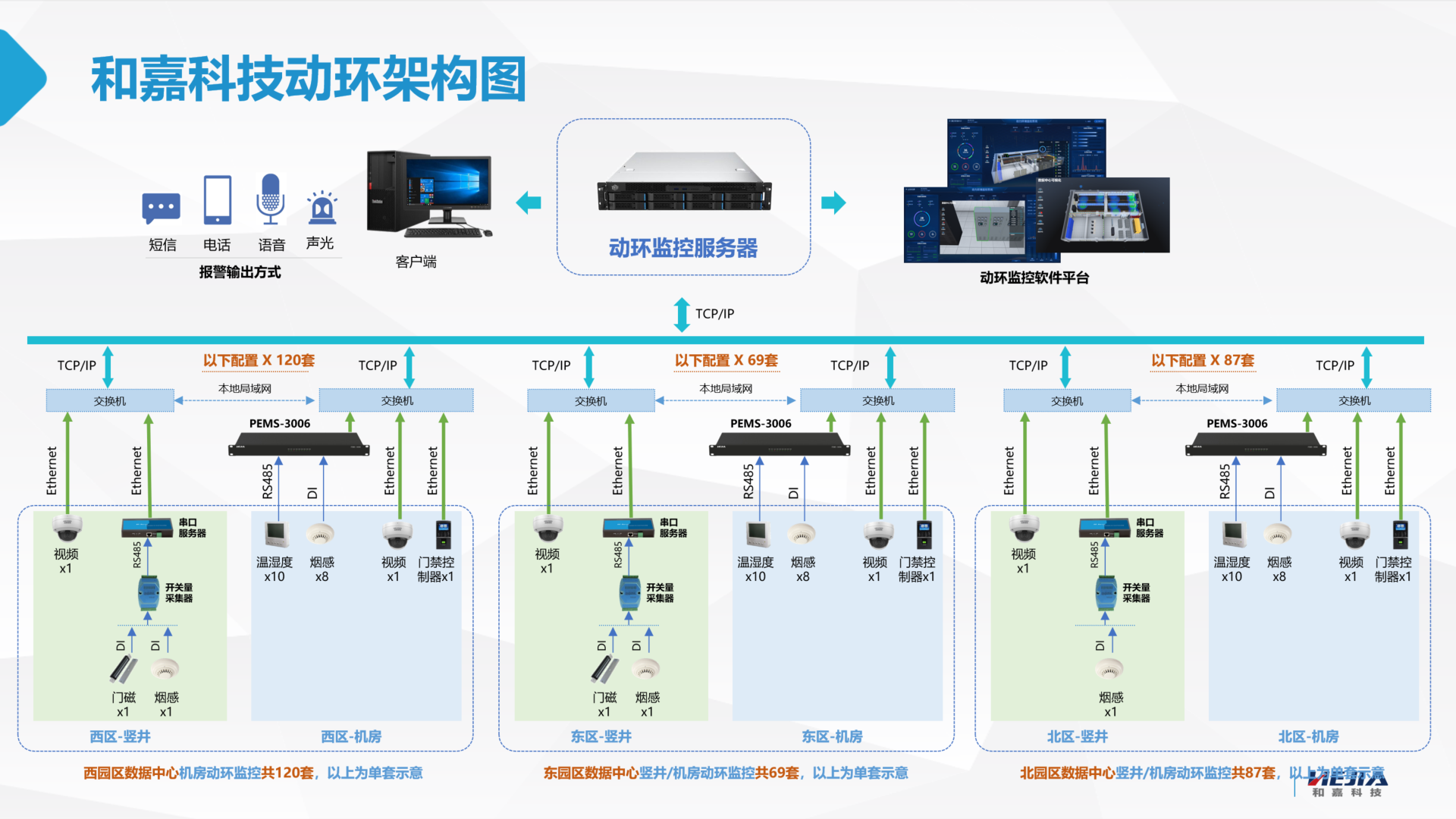 下面以某園區二百多個分散點動環監控集中采集項目為例,該項目數據中心分為西園區、東園區和北園區三個大的區域,每個園區中分散有幾十到上百個數量的豎井和機房,針對這個項目,我們的系統架構圖設計如下: