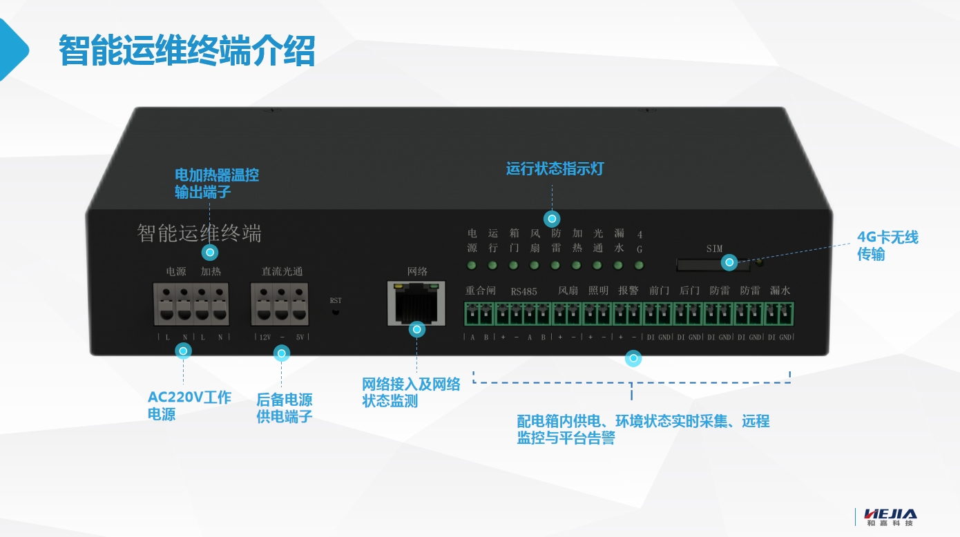 改造方案:智能運維箱內置智能運維終端,集成配電監測、網絡監測、防雷監測、溫濕度監測、風扇控制、門磁監測、漏水監測、開門報警等功能,實現遠程監控與運維效率提升