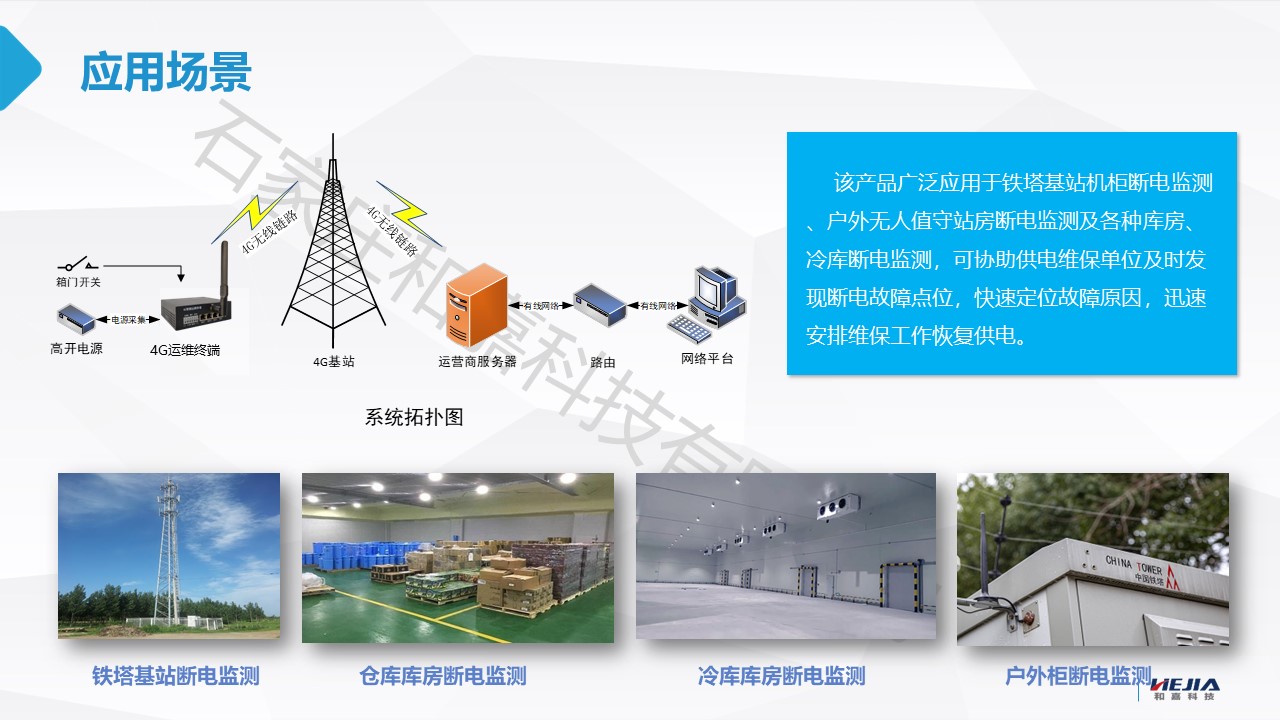該產品廣泛應用于鐵塔基站機柜斷電監測、戶外無人值守站房斷電監測及各種庫房、冷庫斷電監測,可協助供電維保單位及時發現斷電故障點位,快速定位故障原因,迅速安排維保工作恢復供電。